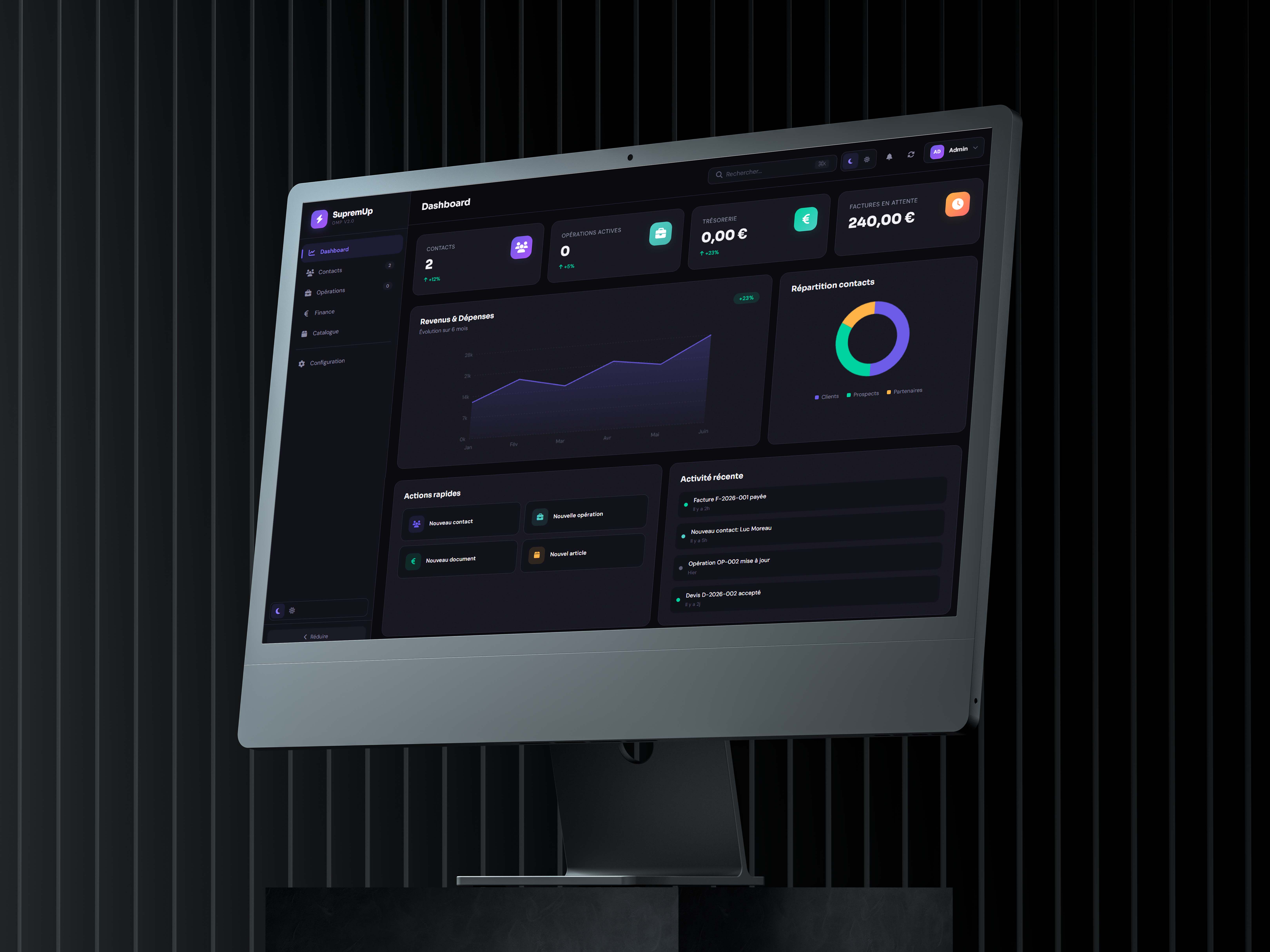Vue d’ensemble temps réel : CA, projets actifs, clients, tâches. Graphiques et statistiques automatiques.
